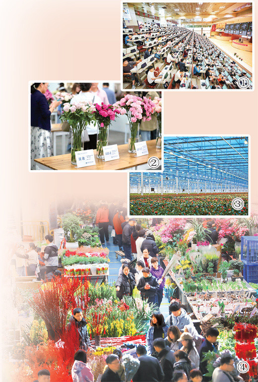 图①:昆明国际花卉拍卖中心交易大厅。 资料图片 图②:2024年4月,云南省农业科学院花卉研究所举办“月季新品种开放日”活动。 刘洪斌摄 图③:云南云天化花匠铺科技有限责任公司的高标准智能温室大棚。 资料图片 图④:1月14日,在昆明斗南花卉市场,市民正在选购年宵花。 刘洪斌摄